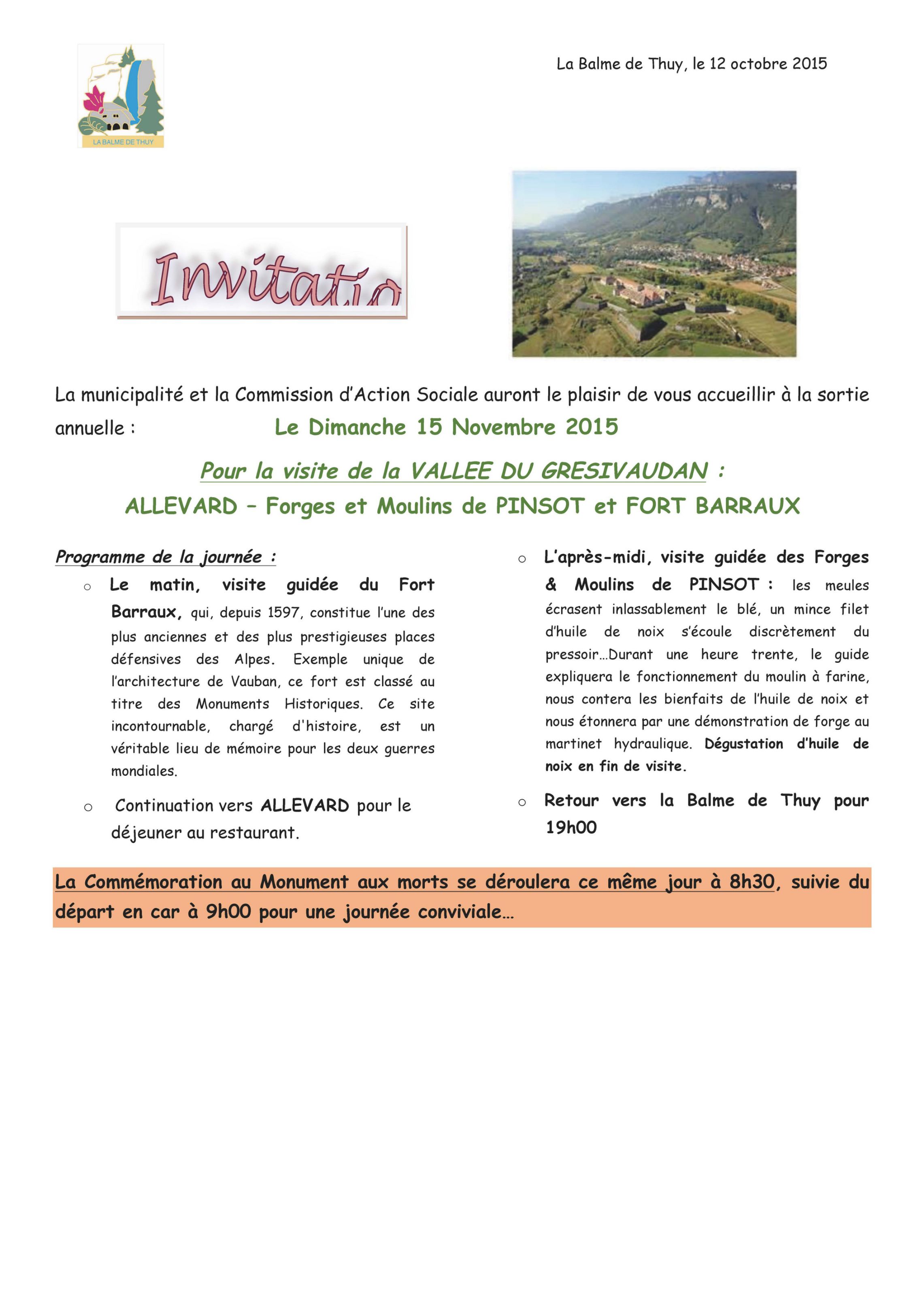 Le Dimanche 15 Novembre 2015 la commune a organisé la cérémonie du 11 novembre puis la visite de la VALLEE DU GRESIVAUDAN : ALLEVARD – Forges et Moulins de PINSOT et FORT BARRAUX.